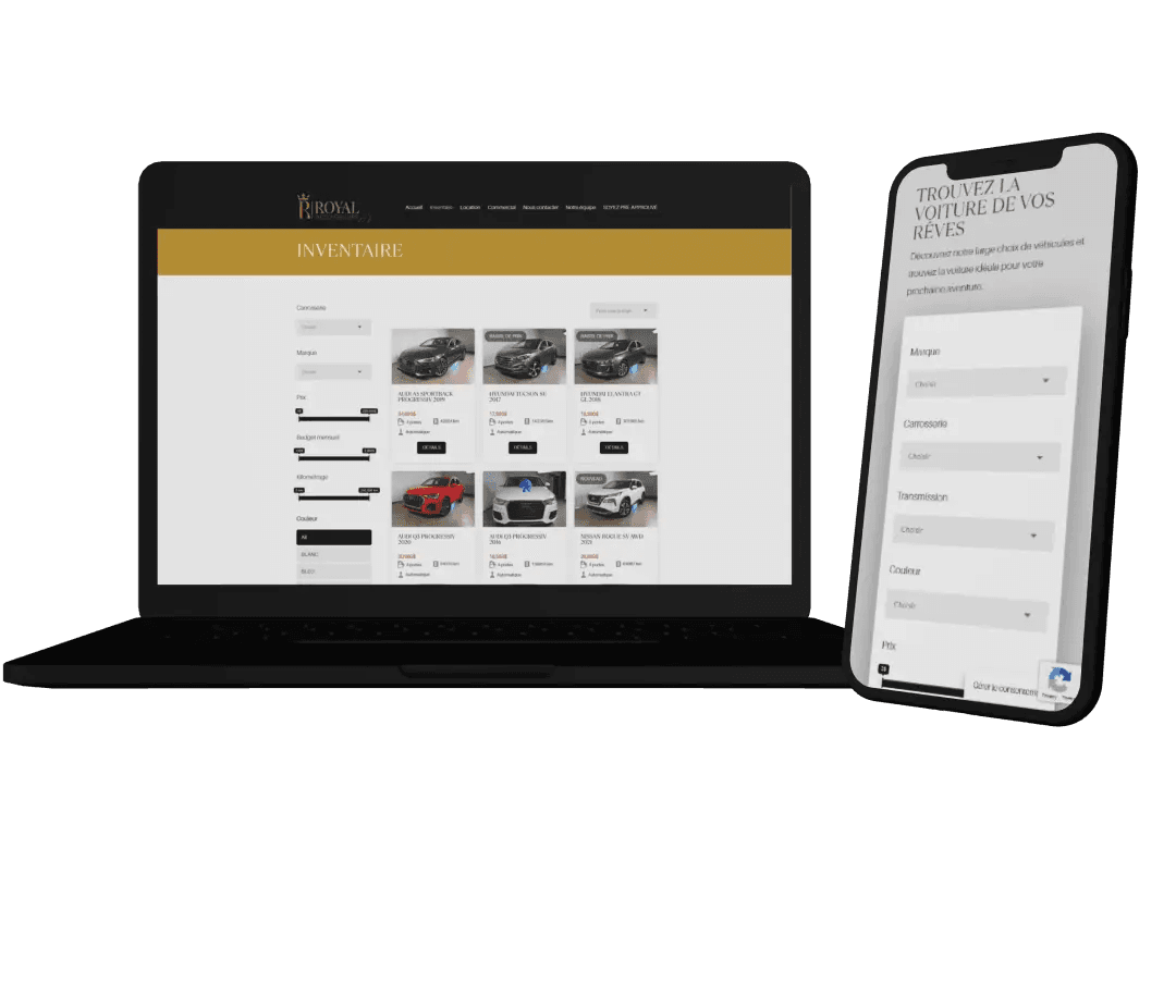 J’ai créé le site ROYAL AUTO GROUPE en utilisant WordPress, en mettant en œuvre des champs ACF (Advanced Custom Fields) et en concevant une mise en page avec Divi. Voici les points forts de mon travail sur ce projet : Recherche en direct de véhicules, optimisation des images, mise en pages dynamique lié au affichages, protection des formulaires par ReCaptcha V3, transfert de domaine et connexion à Google Workspace et création de groupes Google pour les réceptions des formulaires.